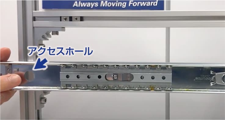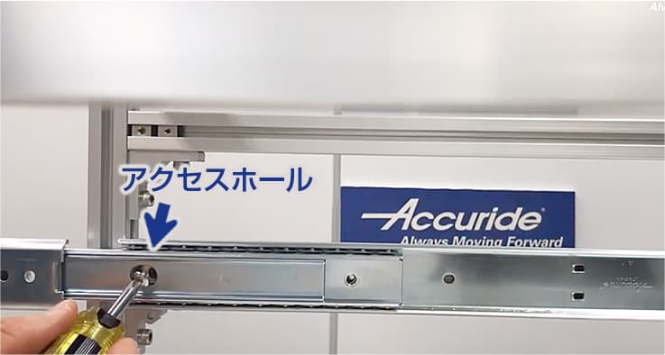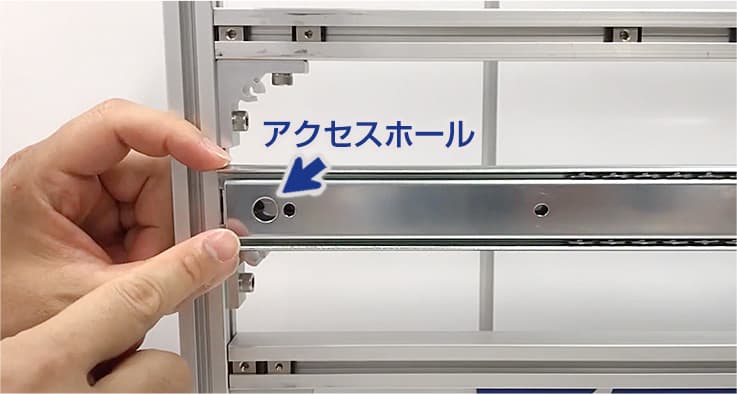 2キャビネットメンバーのフロント側の取付穴はアクセスホールを介してねじを止めます。