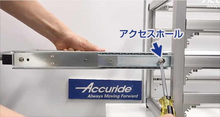 3キャビネットメンバーのフロント側の取付穴はアクセスホールを介してねじを止めます。