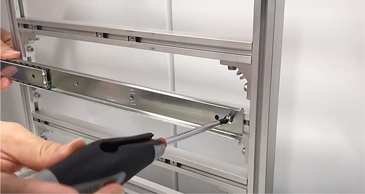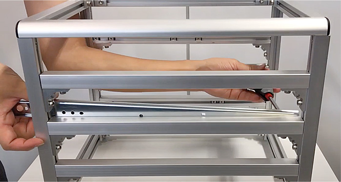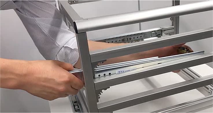 4左右のスライドレールの平行を確認し、ヒキダシも仮締めで取り付けます。