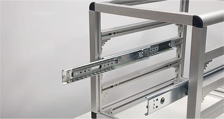 全開させた際に、ドロワーメンバー(インナーメンバー)をフロント方向に引き抜きできるスライドレール。フロントディスコネクトには以下の3タイプがあります。