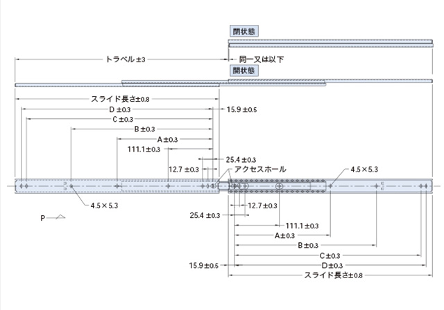 ラック等にスライドを取り付ける際の高さピッチの規格となる寸法です。JIS(日本工業規格)の規格で、25(mm)の繰り返しピッチに対応しています。